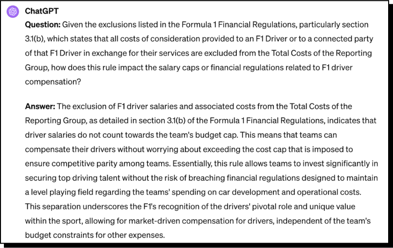 For example, when asked about driver salaries, the LLM would generally not produce an accurate response. Closer inspection revealed the cause. The FIA uses the phrase “Cost of Consideration” instead of “salary.” The LLM fails even when semantic search surfaces relevant regulations because it doesn’t know “Cost of Consideration” includes salary.